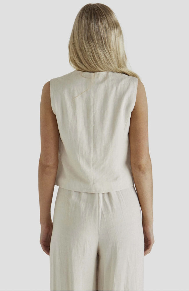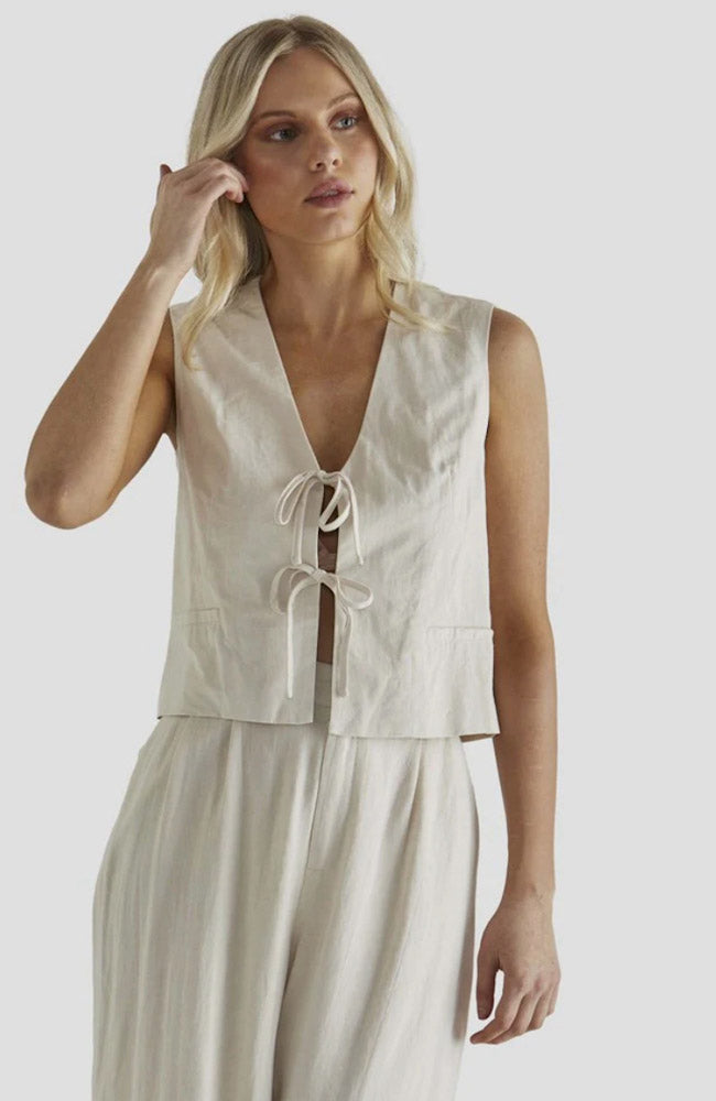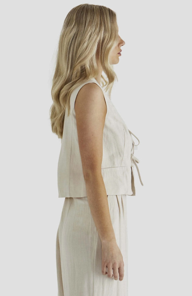 The Natalia Vest is a refined layering piece designed with a soft drapey fabric and a thin tie opening for an elegant touch. Fully lined with welt pocket details, this vest is perfect for elevating both casual and formal outfits.